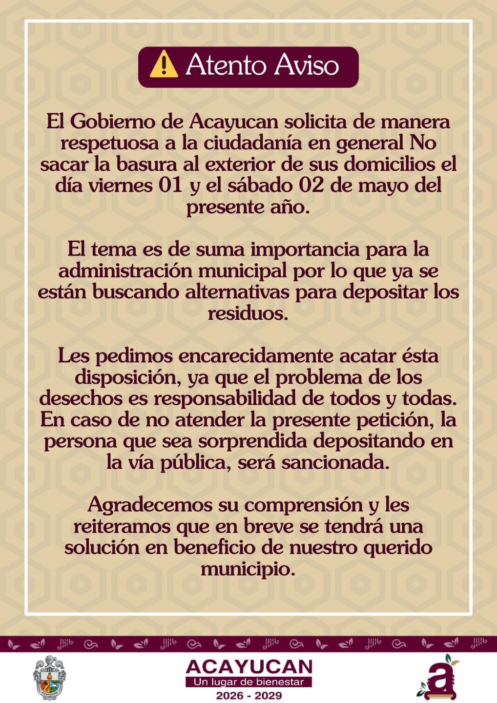 Acayucan, Veracruz, 30 de abril de 2026.– El Gobierno Municipal de Acayucan emitió un aviso dirigido a la ciudadanía para solicitar que no se saque la basura a la vía pública durante los días viernes 1 y sábado 2 de mayo, como parte de medidas temporales ante la situación del manejo de residuos.