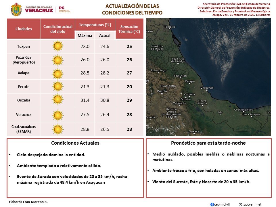 Veracruz, Ver.– Autoridades emitieron una actualización de las condiciones del tiempo este 26 de febrero de 2026 para distintas regiones del estado de Veracruz, con el objetivo de mantener informada a la población.