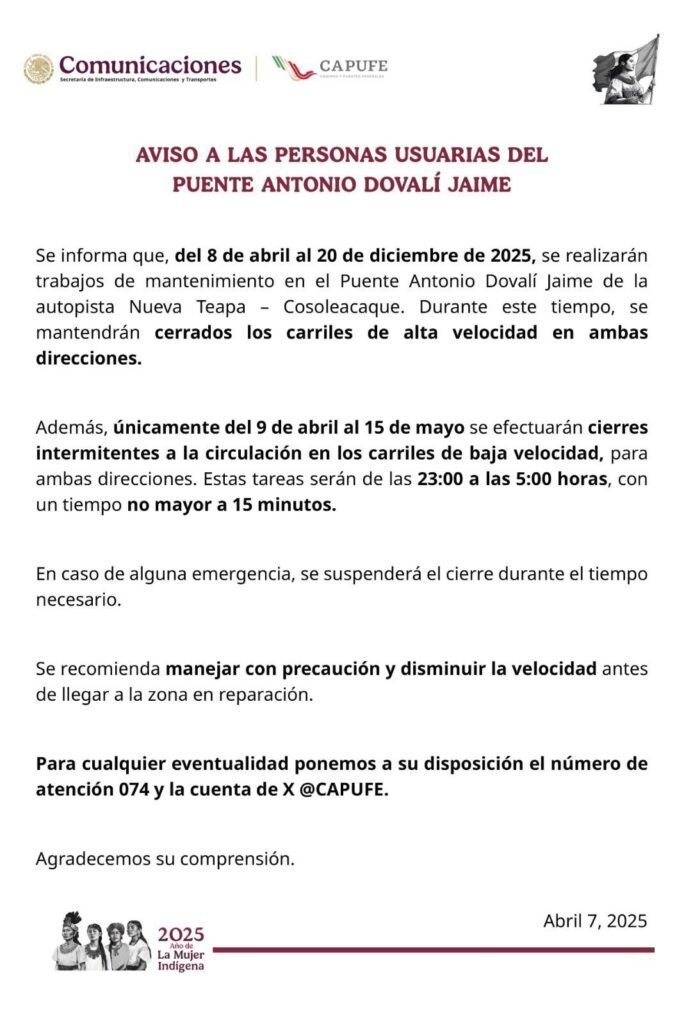 Caminos y Puentes Federales (CAPUFE) informó que, como parte de los trabajos de mantenimiento programados en el Puente Antonio Dovalí Jaime, también conocido como Puente Coatzacoalcos, se llevarán a cabo cierres parciales en distintos horarios y carriles a partir del 8 de abril y hasta el 20 de diciembre de 2025.