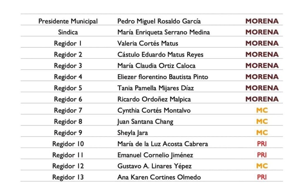 Estas 13 regidurías acompañarán en la administración municipal al alcalde electo Pedro Miguel Rosaldo García y a la síndica única María Enriqueta Serrano Medina, quienes encabezarán el gobierno local por los próximos cuatro años.
