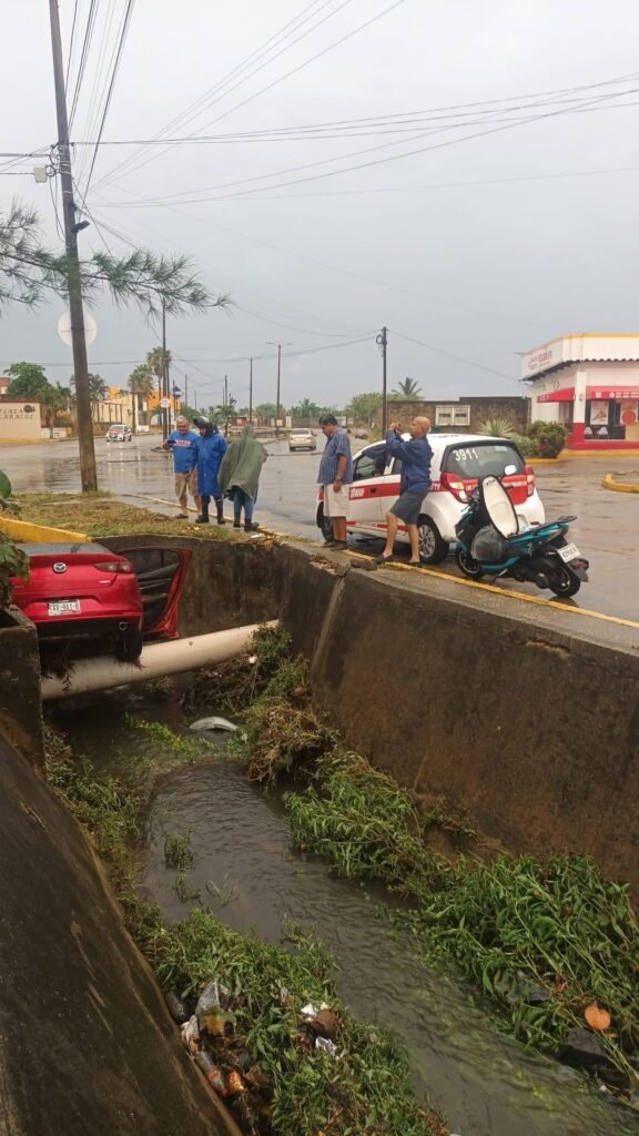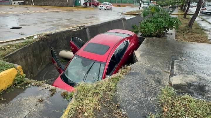 Un automóvil cayó dentro del canal pluvial que atraviesa la avenida Jirafas, ubicada al poniente de la ciudad de Coatzacoalcos.