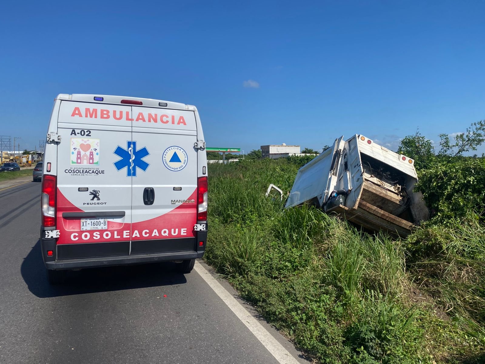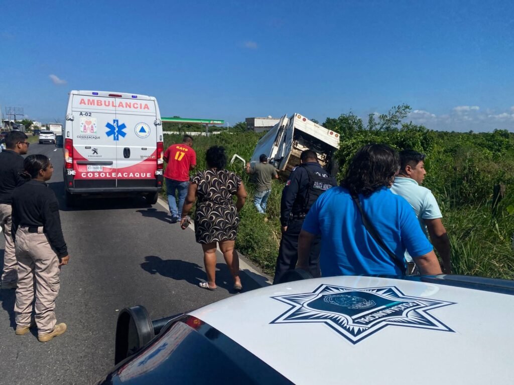 Posteriormente, arribó la Policía Municipal de Cosoleacaque, que se encargó de abanderar el área, coordinar la vialidad y prevenir otro accidente, debido a que la unidad quedó fuera de la carretera.
