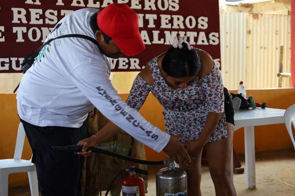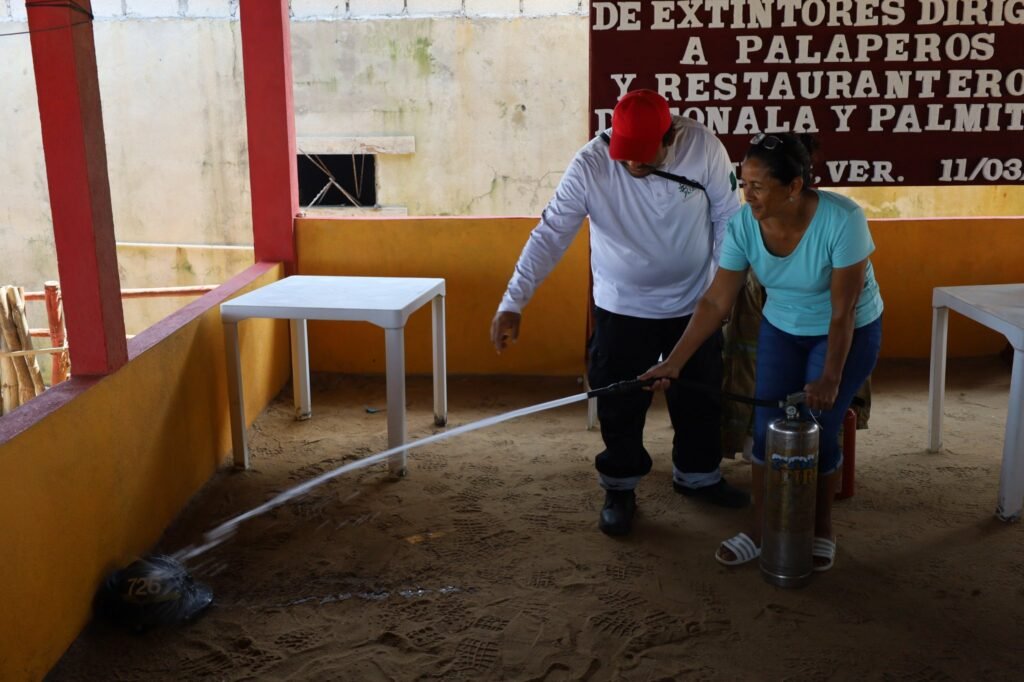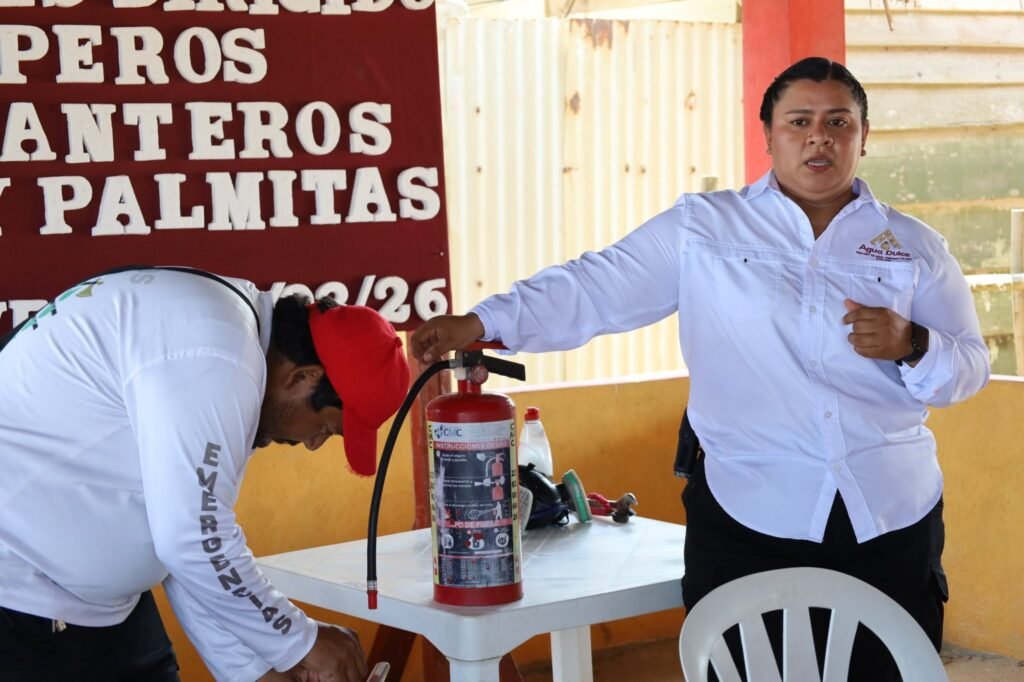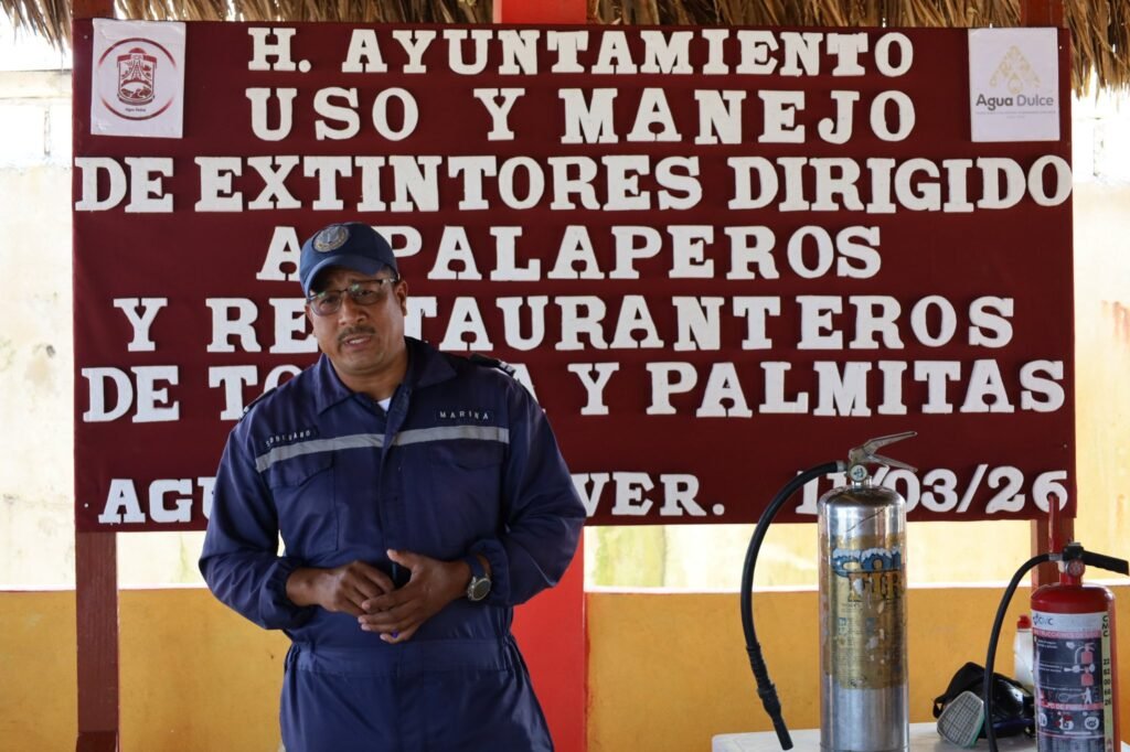 Agua Dulce, Ver., 13 de marzo de 2026.– La Dirección de Protección Civil de Agua Dulce impartió un curso de uso y manejo de extintores dirigido a palaperos de las congregaciones de Tonalá, Agua Dulce, Veracruz y Las Palmitas, Agua Dulce, Veracruz, con el objetivo de fortalecer la prevención y la seguridad en la zona turística del municipio.
