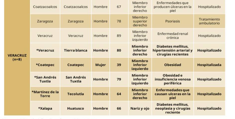 El boletín epidemiológico indica que la mayoría de los casos registrados en Veracruz corresponden a personas adultas mayores o pacientes con enfermedades previas, especialmente padecimientos que generan heridas o lesiones en la piel.