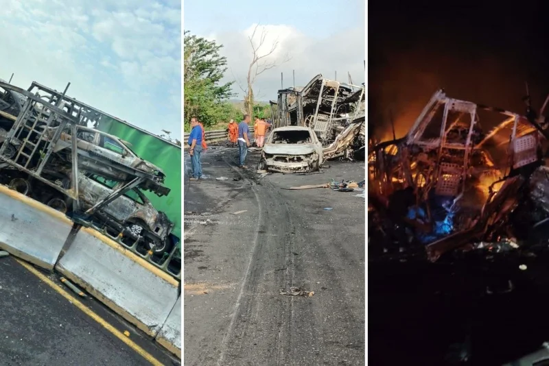 Acayucan, Ver., 10 de abril de 2026.- Un fuerte choque entre un tractocamión y una madrina derivó en un incendio de gran magnitud que dejó como saldo preliminar al menos 10 vehículos calcinados, además del cierre total de la autopista La Tinaja–Cosoleacaque, en el tramo Isla–Acayucan.