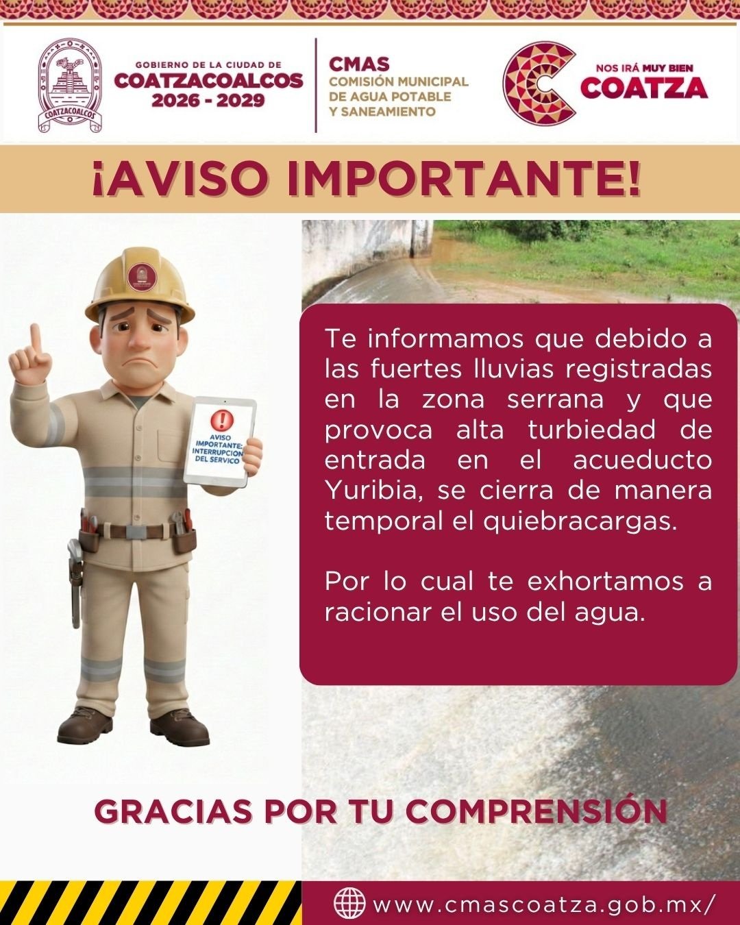 Coatzacoalcos, Ver., 1 de abril de 2026.– La Comisión Municipal de Agua y Saneamiento (CMAS) de Coatzacoalcos informó que las lluvias registradas la noche del martes provocaron el cierre del quiebracargas del sistema Yuribia, lo que podría generar afectaciones en el suministro de agua potable en la ciudad.