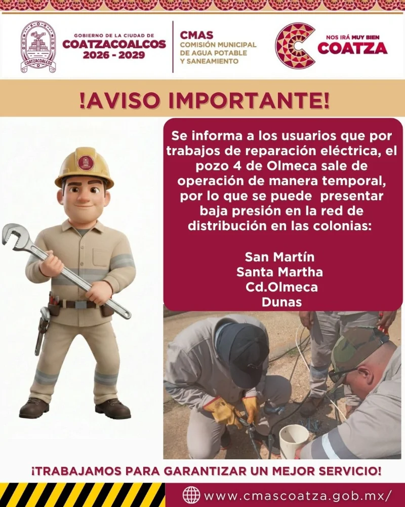 Coatzacoalcos, Ver., 7 de abril de 2026.– La Comisión Municipal de Agua Potable y Saneamiento (CMAS) informó que el pozo 4 de Ciudad Olmeca fue sacado de operación de manera temporal debido a trabajos de reparación eléctrica, lo que podría generar baja presión en el suministro en diversas colonias.