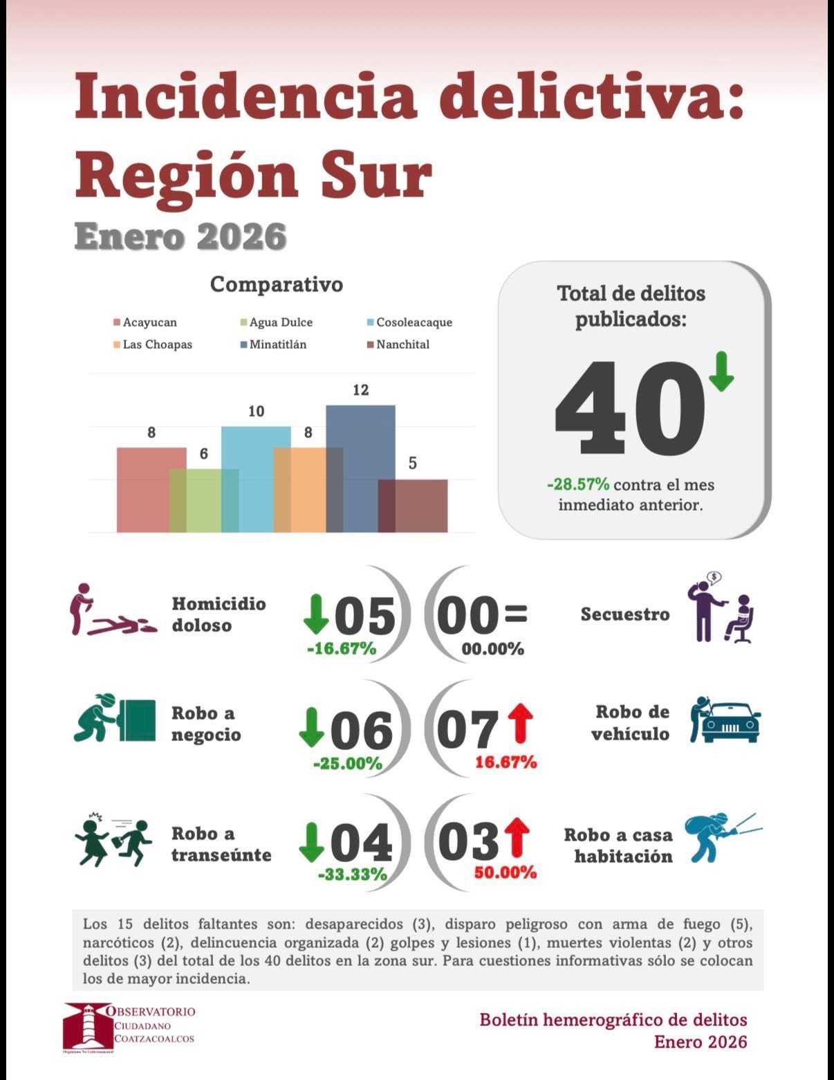 El Observatorio Ciudadano de Coatzacoalcos (OCC) reportó una disminución del 16.36 por ciento en la incidencia delictiva general durante enero; sin embargo, cinco hombres fueron asesinados en ese mismo periodo, encendiendo focos rojos en materia de homicidio doloso.