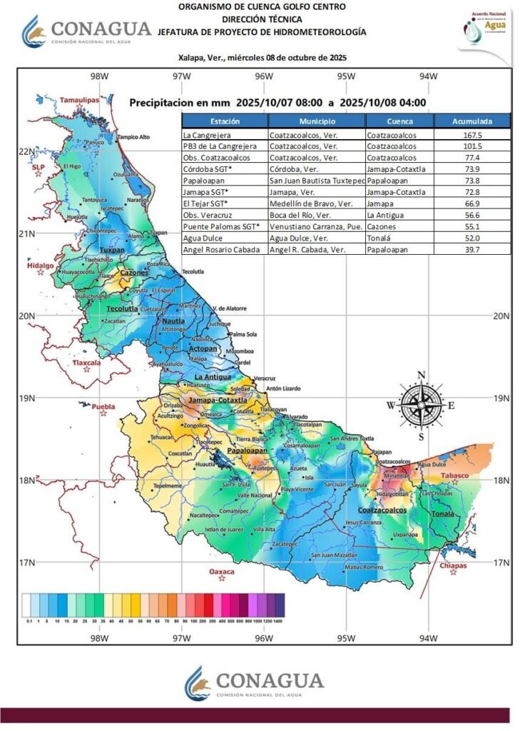 Según el reporte emitido por la Dirección Técnica de Hidrometeorología del organismo, en la estación La Cangrejera, ubicada en dicho municipio, se registraron 167.5 milímetros de precipitación entre las 08:00 horas del 7 de octubre y las 04:00 horas del 8 de octubre de 2025.