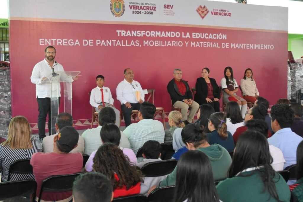 Durante el evento realizado en el municipio, se realizó la entrega de pantallas, mobiliario escolar y material para mantenimiento a 21 secundarias y telesecundarias de Coatzacoalcos y la región, como parte de una estrategia estatal enfocada en fortalecer la educación pública.