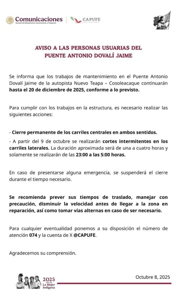 Los trabajos de mantenimiento en el Puente Antonio Dovalí Jaime, conocido como Coatzacoalcos II, se prolongarán hasta el 20 de diciembre de 2025, informó Caminos y Puentes Federales (CAPUFE).