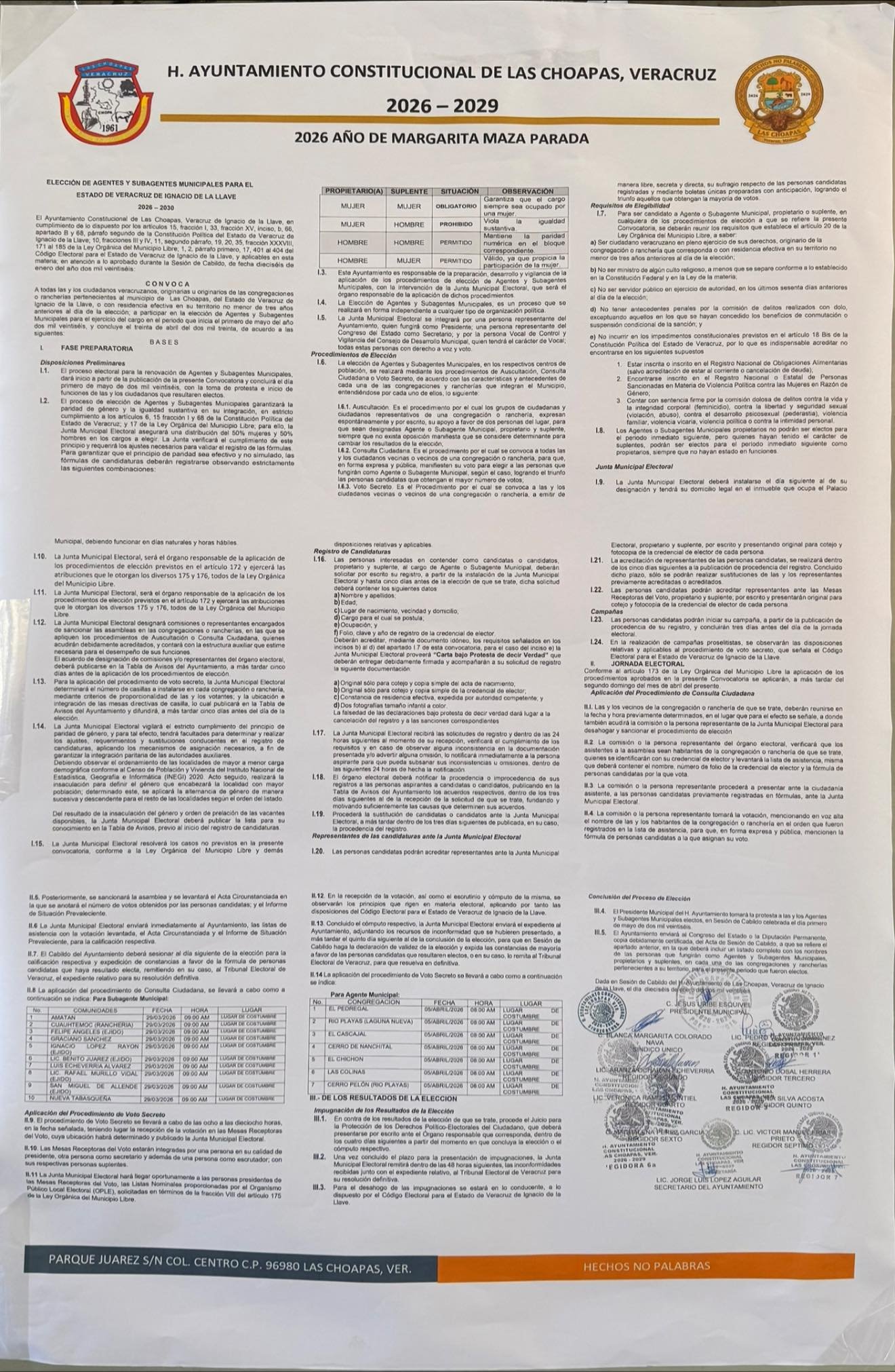Las Choapas, Ver., 25 de febrero de 2026.– Autoridades municipales informaron sobre la publicación de la convocatoria para la elección de agentes y subagentes municipales en el municipio de Las Choapas, proceso que se realizará conforme a lo establecido por la ley.