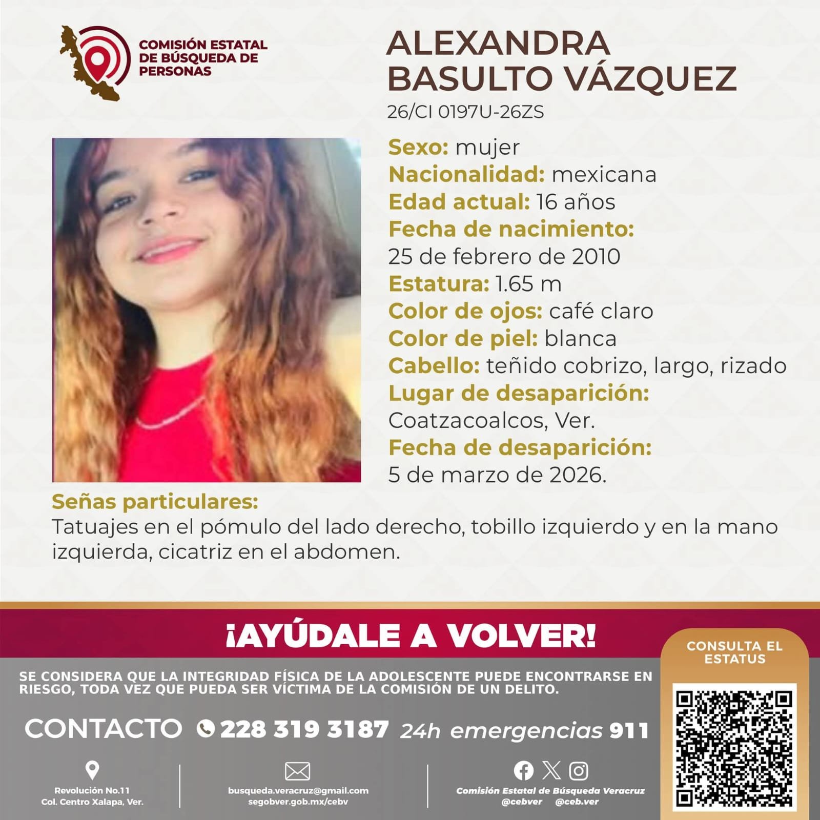 Coatzacoalcos, Veracruz, 9 de marzo de 2026.– La Comisión Estatal de Búsqueda de Personas de Veracruz emitió una ficha para localizar a la adolescente Alexandra Basulto Vázquez, de 16 años de edad, quien fue reportada como desaparecida desde el pasado 5 de marzo en el municipio de Coatzacoalcos, al sur del estado.
