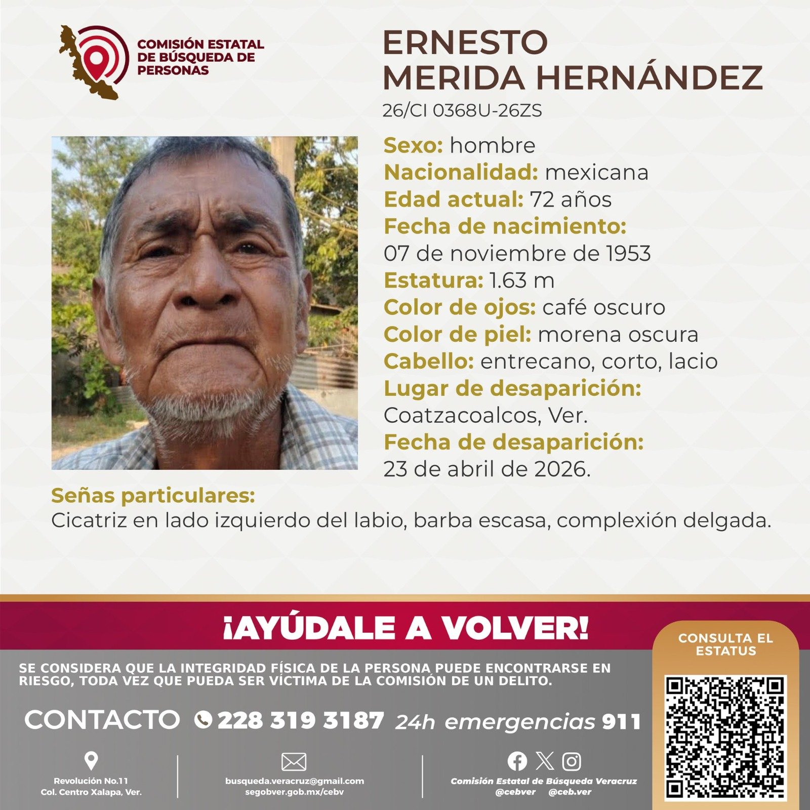 Coatzacoalcos, Ver., 24 de abril de 2026.- Autoridades y familiares mantienen la búsqueda de Ernesto Mérida Hernández, un adulto de 72 años de edad que fue reportado como desaparecido desde el pasado jueves 23 de abril en este municipio del sur de Veracruz.