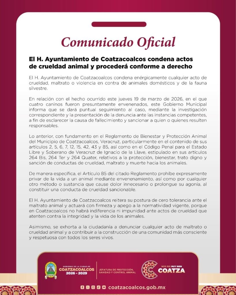 Ante la gravedad del caso, el Ayuntamiento de Coatzacoalcos emitió un posicionamiento oficial en el que condenó enérgicamente estos hechos y reiteró su rechazo a cualquier forma de maltrato animal.