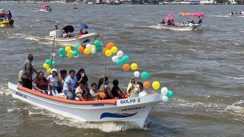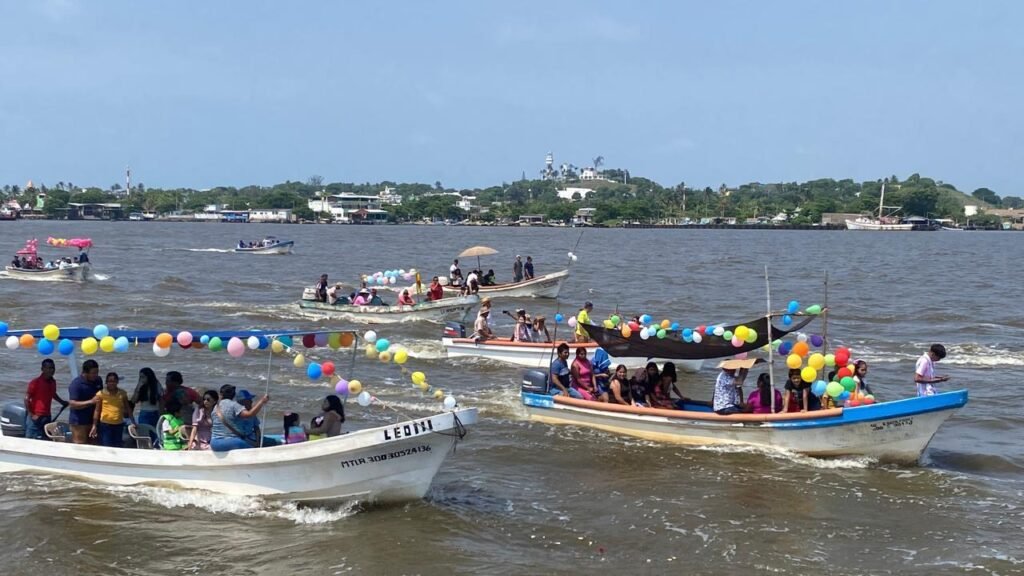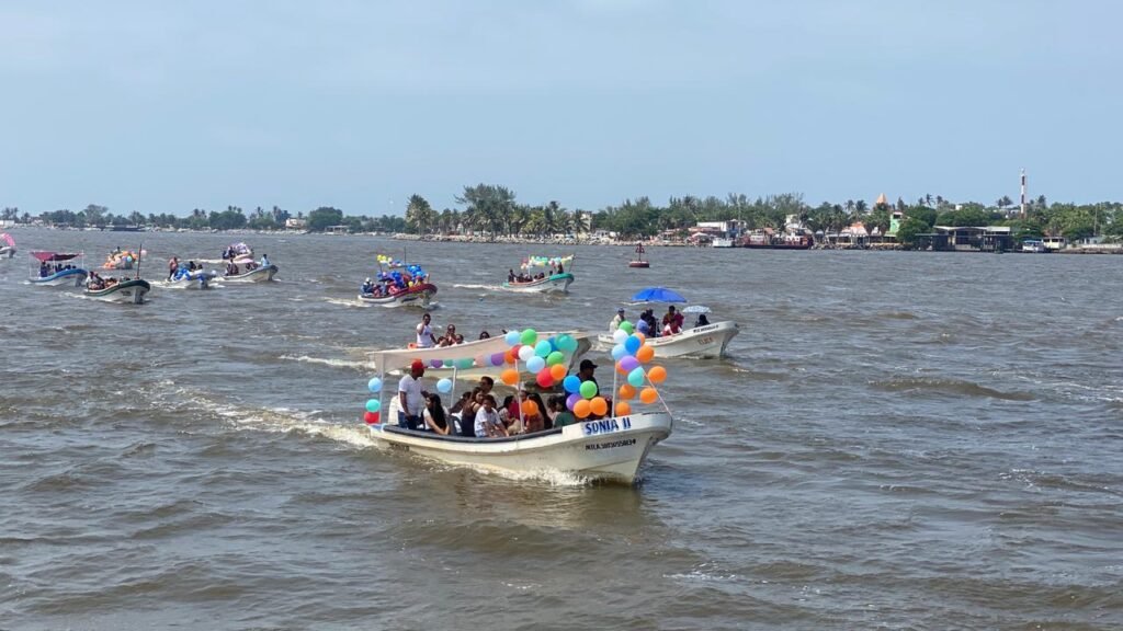 Tras la celebración eucarística, decenas de embarcaciones adornadas con flores, globos y listones partieron desde el embarcadero conocido como “La Ensenada”, dando inicio al tradicional recorrido fluvial.