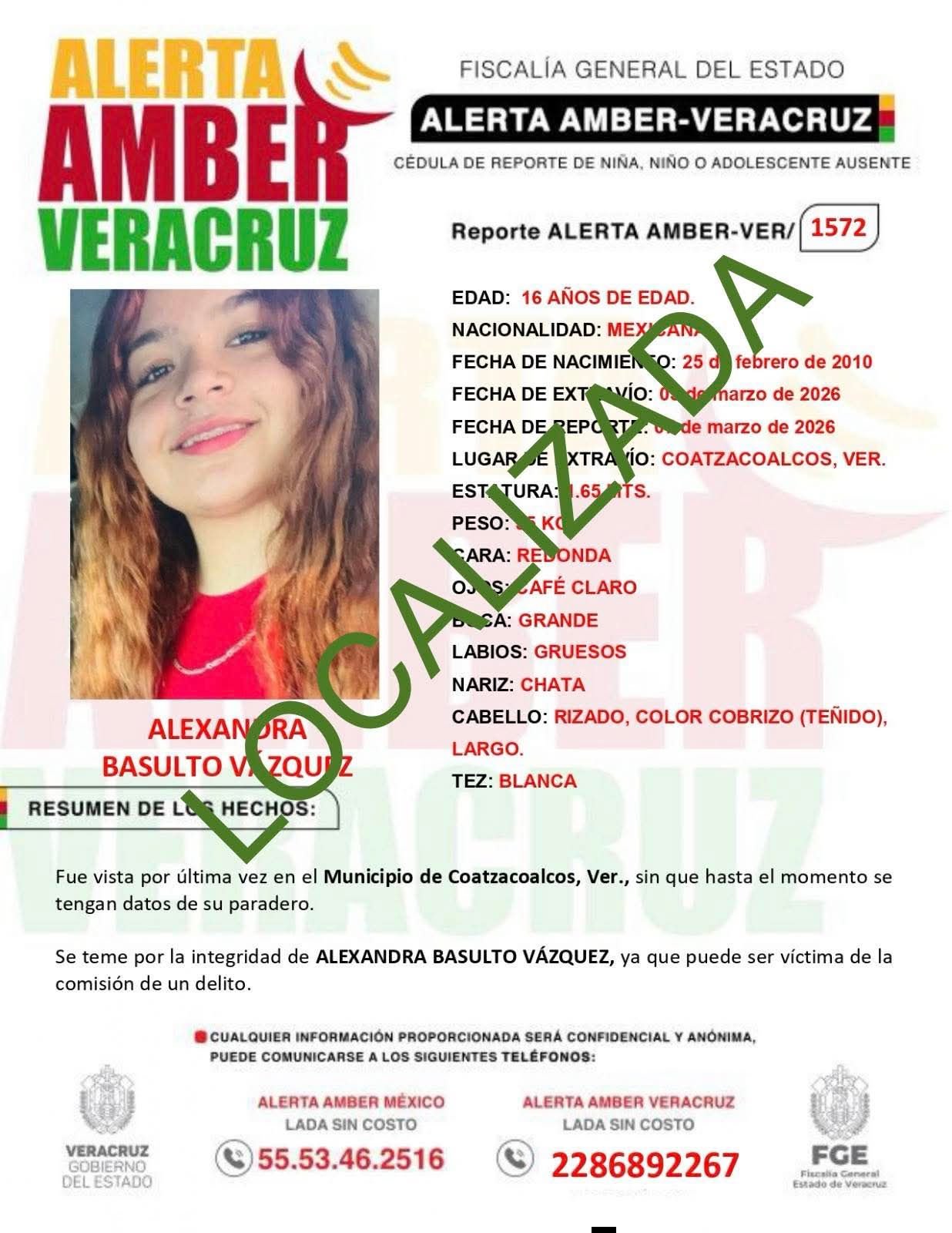 Coatzacoalcos, Veracruz, 10 de marzo de 2026.– La noche de este martes fue localizada la joven Alexandra Basulto Vázquez, quien había sido reportada como desaparecida desde hace cuatro días en el municipio de Coatzacoalcos.