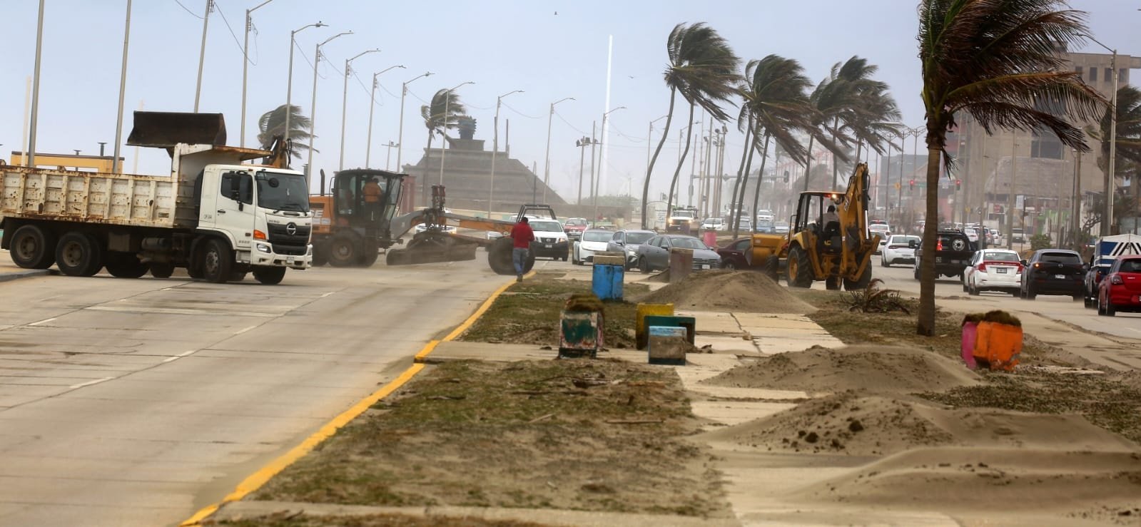 Las labores se realizan con apoyo de retroexcavadoras, maquinaria especializada y camiones de volteo, con el objetivo de restablecer las condiciones de seguridad en el bulevar costero.