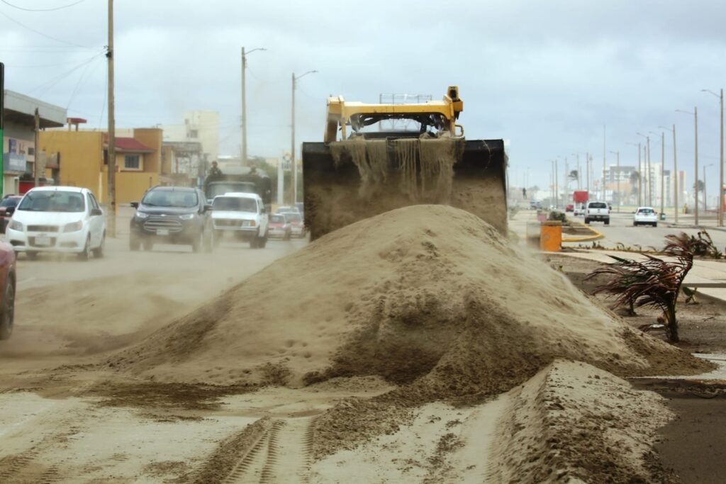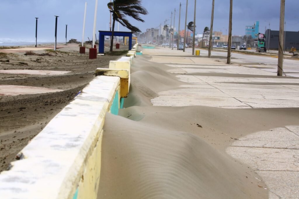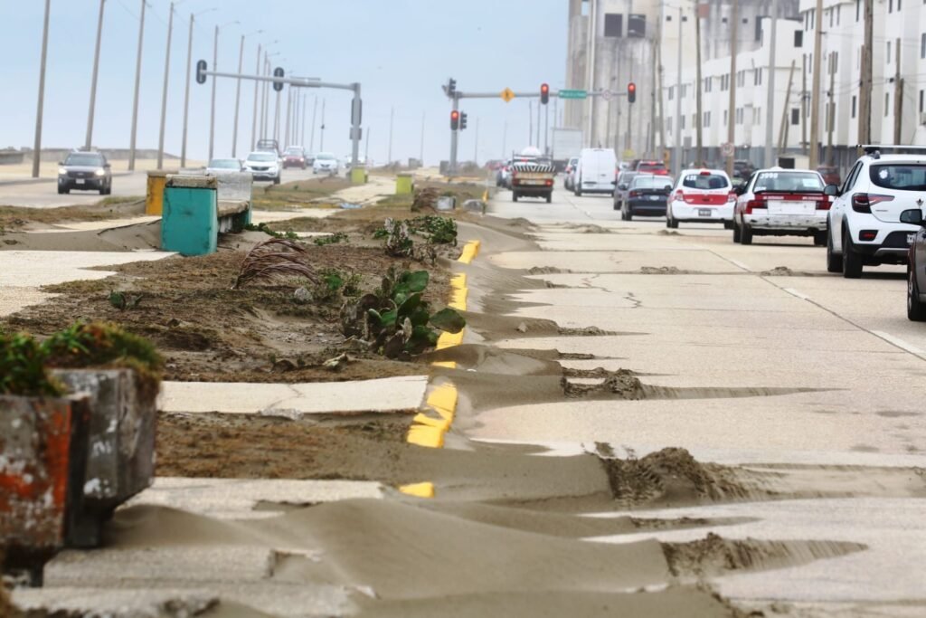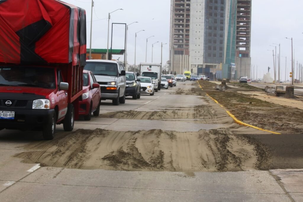 El fenómeno de norte provocó que grandes cantidades de arena y palizada se depositaran sobre la carpeta asfáltica, principalmente en zonas cercanas a la franja costera, lo que dificultó la circulación vehicular y representó un riesgo para quienes transitan por esta importante vialidad.