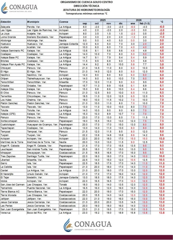 Mecayapan, Ver.– El municipio de Mecayapan se posicionó como el punto con la temperatura más baja registrada en el sur de Veracruz, al alcanzar 9.5 grados Celsius, de acuerdo con el más reciente reporte emitido por la Comisión Nacional del Agua (Conagua).