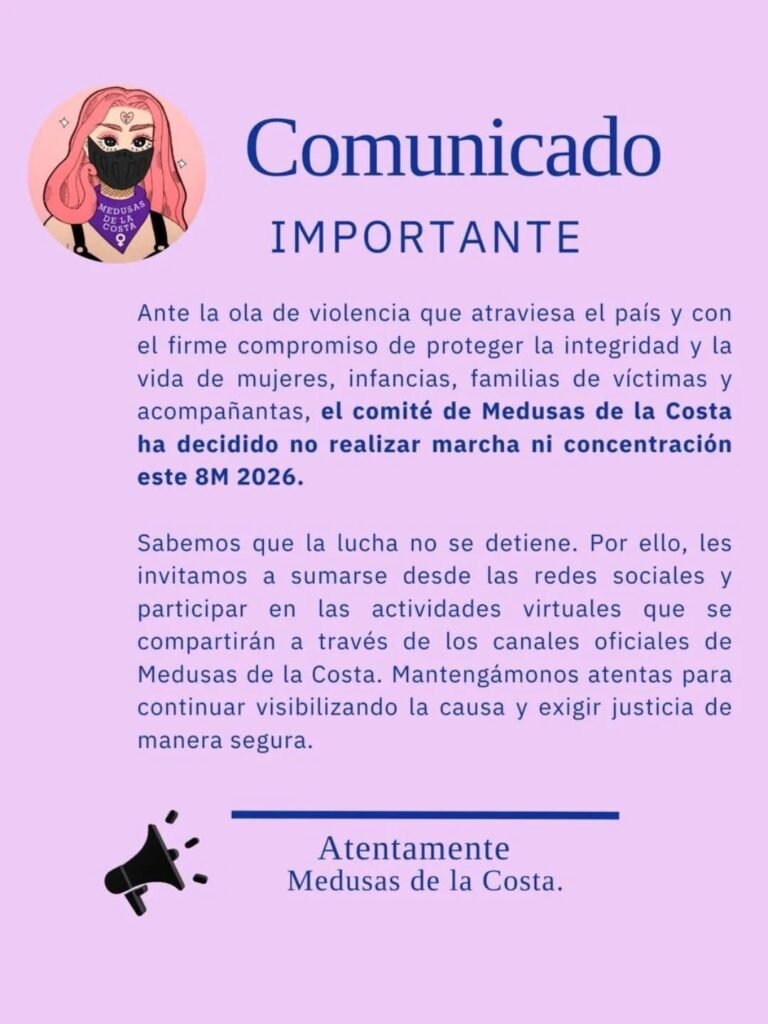 Coatzacoalcos, Ver.– La colectiva Medusas de la Costa anunció que no realizará marcha ni concentraciones presenciales durante la jornada del 8 de marzo (8M) de 2026 en el municipio.