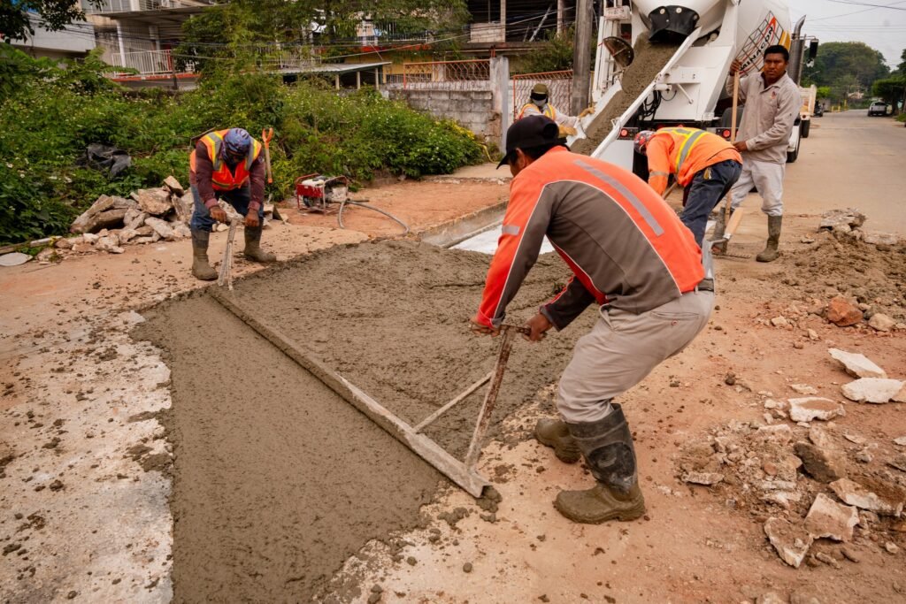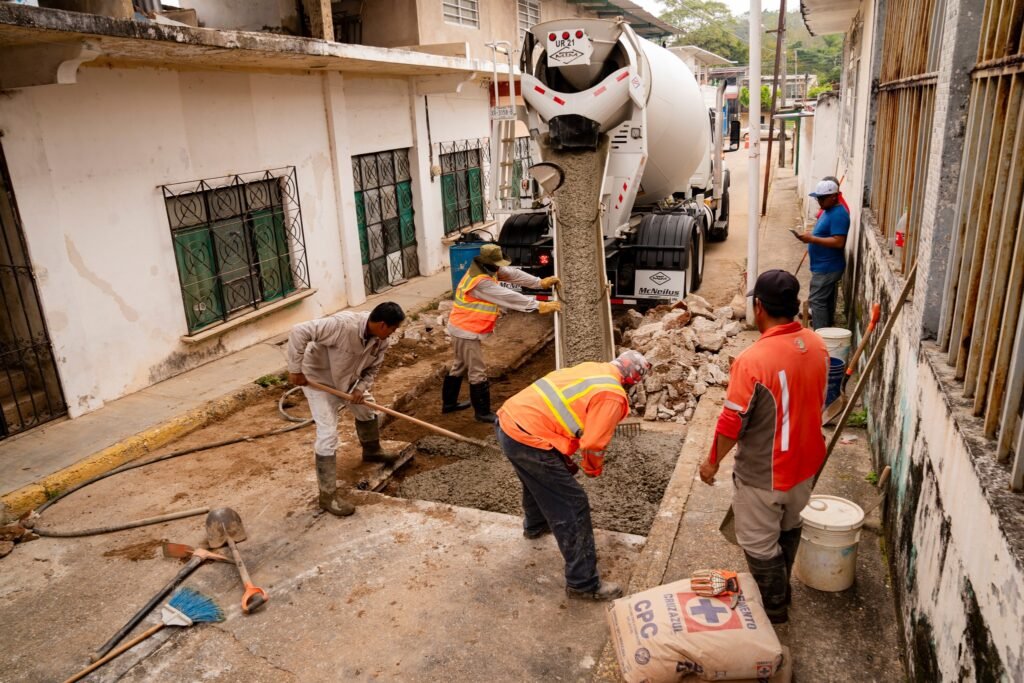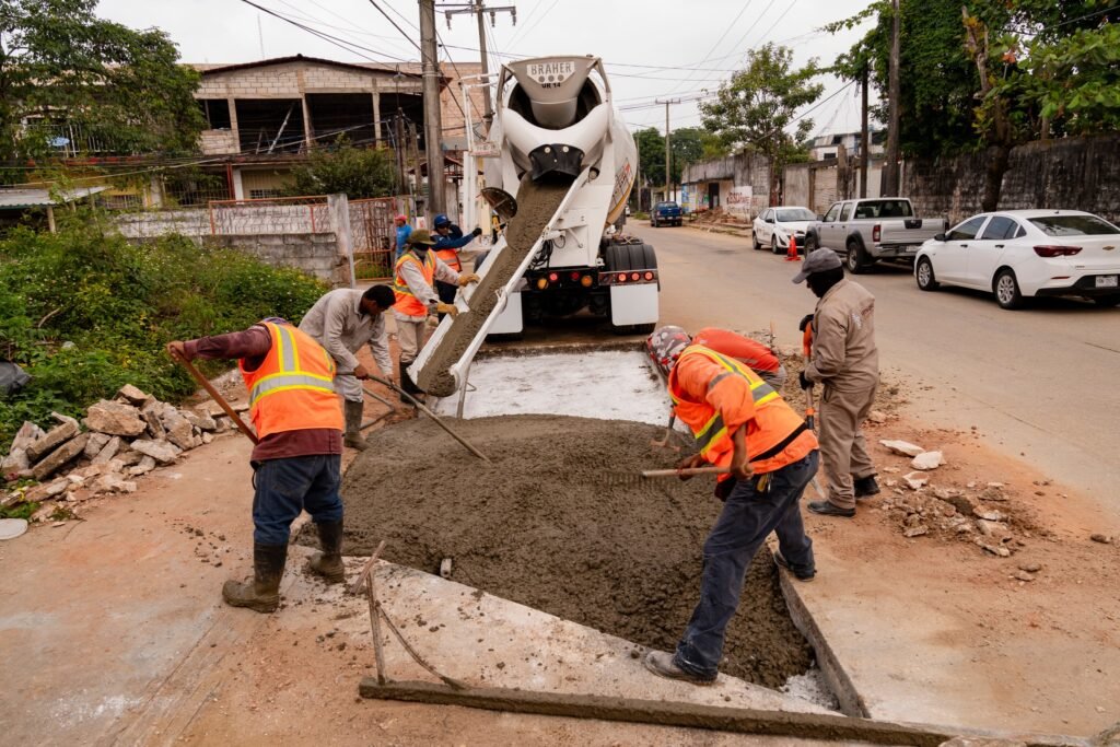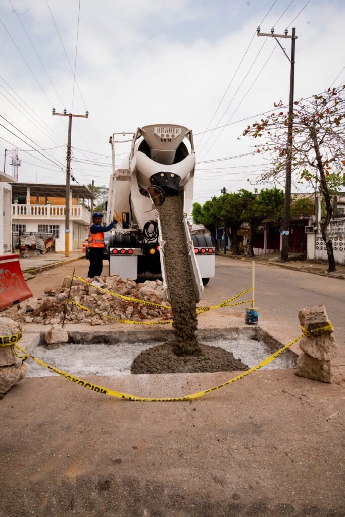 Posteriormente, personal de la Dirección de Obras Públicas efectuó vaciados de concreto en puntos específicos para garantizar mayor durabilidad y seguridad en la circulación vehicular y peatonal.