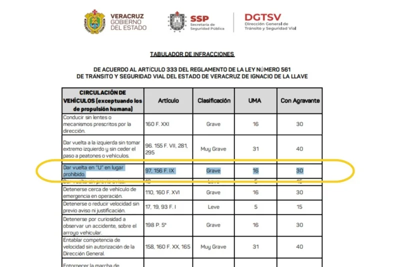 Realizar una vuelta en “U” en un lugar prohibido en el estado de Veracruz es considerada una falta grave. Las sanciones van de: