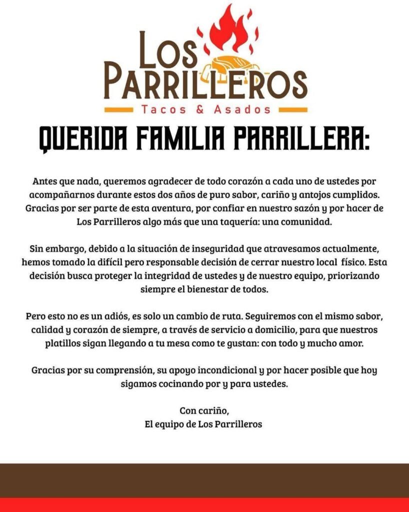 Se trata del establecimiento de comida “Los Parrilleros” quienes a través de un comunicado informaron a sus clientes y al público el general el cierre de sus puertas dejando únicamente el servicio a domicilio, lo que representa un desaliento ante el golpe a su economía.