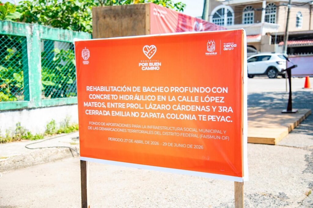 Nanchital, Ver., 28 de abril de 2026.- El Ayuntamiento de Nanchital dio inicio a la obra de rehabilitación con bacheo profundo utilizando concreto hidráulico en la calle López Mateos, ubicada en la colonia Tepeyac.