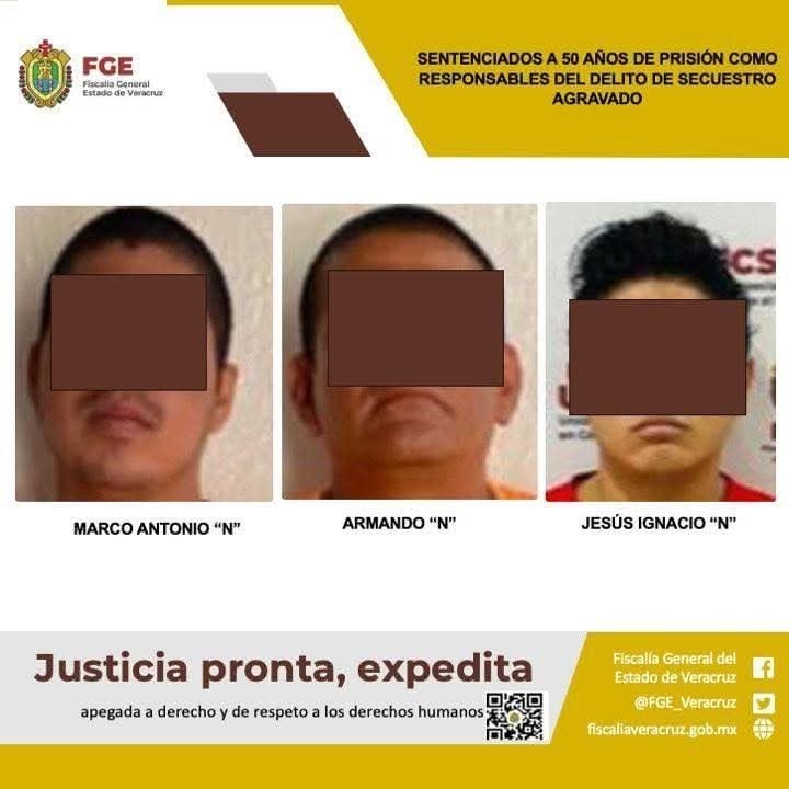 La Fiscalía General del Estado (FGE), a través de la Unidad Especializada en Combate al Secuestro (UECS) con sede en Coatzacoalcos, obtuvo una sentencia condenatoria de 50 años de prisión en contra de Jesús Ignacio “N”, Marco Antonio “N” y “Armando”, por ser penalmente responsables del delito de secuestro agravado.
