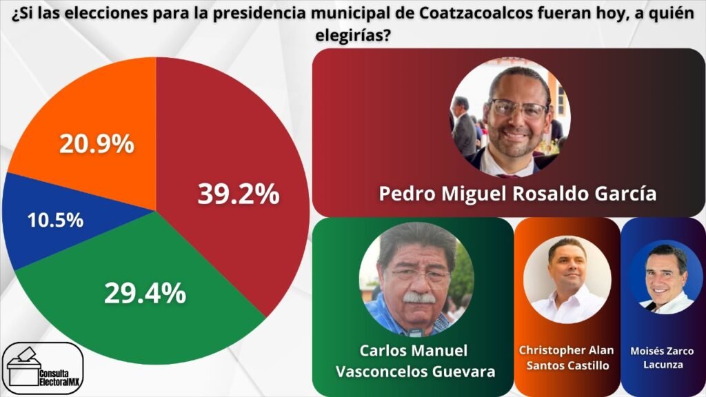 A pocos días de celebrarse las elecciones municipales del próximo domingo 1 de junio, una reciente encuesta realizada por Consulta Electoral MX revela que Pedro Miguel Rosaldo García encabeza las preferencias ciudadanas para ocupar la presidencia municipal de Coatzacoalcos.