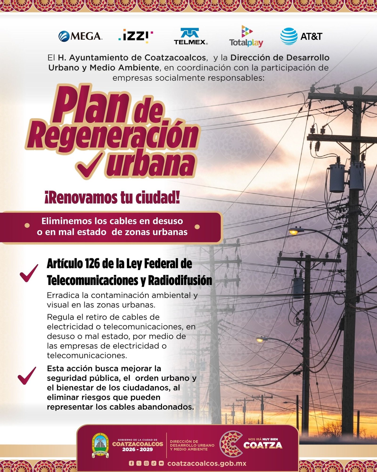 Bajo este marco legal, el Gobierno Municipal exhorta y coordina con las empresas responsables de los servicios de electricidad y telecomunicaciones para que procedan al retiro inmediato de infraestructura obsoleta, evitando que permanezca suspendida en postes o estructuras urbanas.