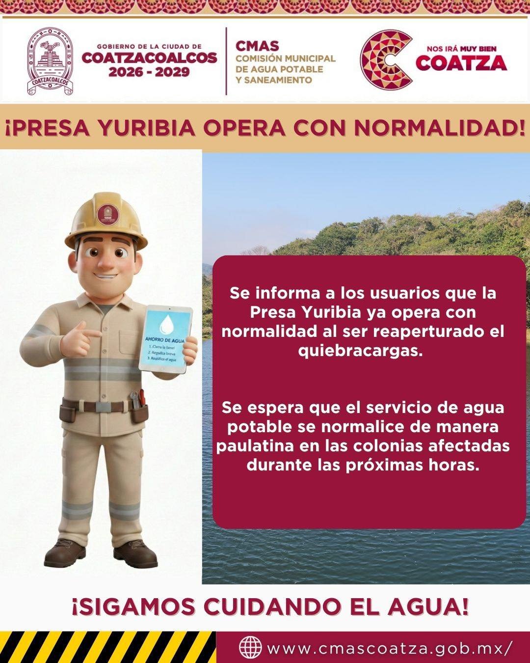 Coatzacoalcos, Ver., 1 de abril de 2026.– Autoridades informaron que la presa Yuribia ya opera con normalidad, luego de que fuera cerrado el quiebracargas debido a los altos niveles de turbiedad provocados por las lluvias recientes.