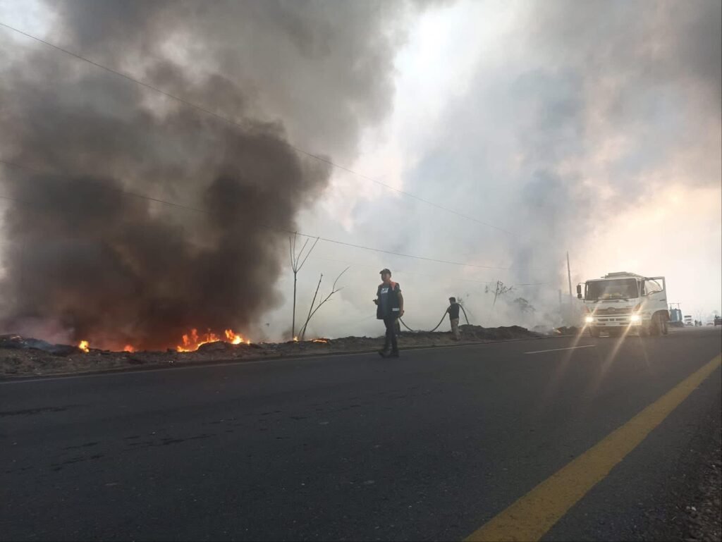El fuego, originado presuntamente por la quema intencional de llantas, se extendió rápidamente a pastizales y una chatarrera, cubriendo el cielo con una espesa nube de humo negro.
