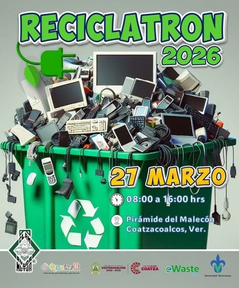 Coatzacoalcos, Veracruz, 10 de marzo de 2026.– Con el objetivo de reducir el impacto ambiental que generan los aparatos electrónicos en desuso, autoridades y organizaciones civiles invitaron a la ciudadanía a participar en el Reciclatrón 2026, que se realizará el próximo 27 de marzo en la Pirámide del Malecón de Coatzacoalcos.