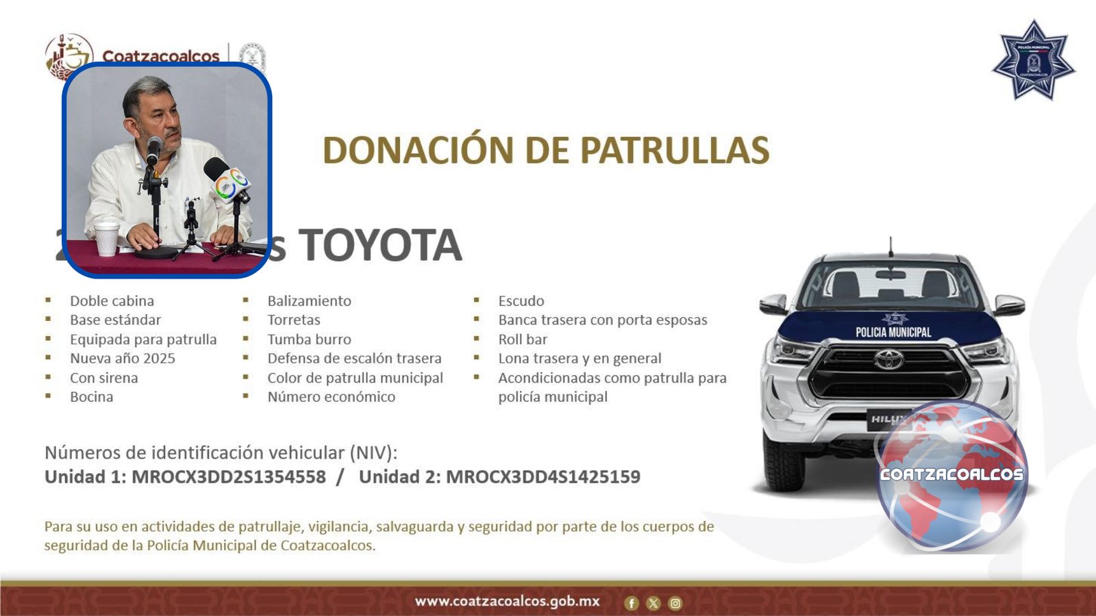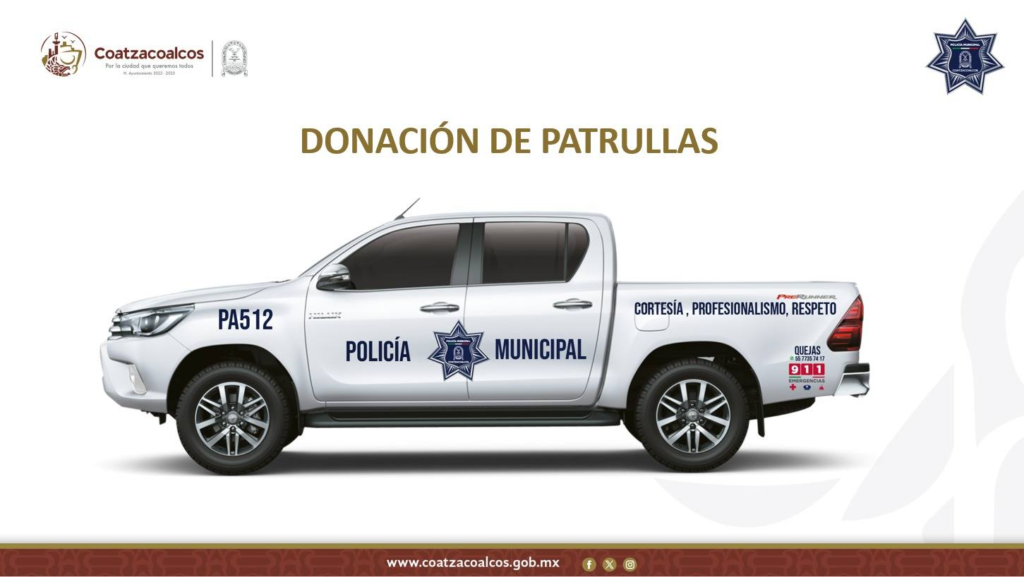 Coatzacoalcos, Ver. – La Policía Municipal de Coatzacoalcos contará con dos nuevas patrullas donadas por la Terminal Química Puerto México, según informó el presidente municipal Amado Cruz Malpica.