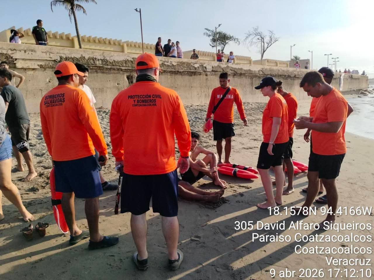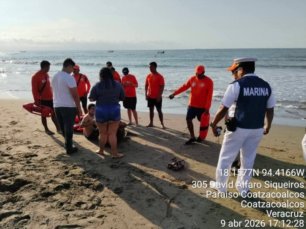 Coatzacoalcos, Ver., 9 de abril de 2026.- La rápida y coordinada intervención de cuerpos de emergencia evitó una tragedia en las playas de Coatzacoalcos, luego de que dos jóvenes estuvieron a punto de perder la vida al no poder salir del mar debido al fuerte oleaje registrado en la zona.