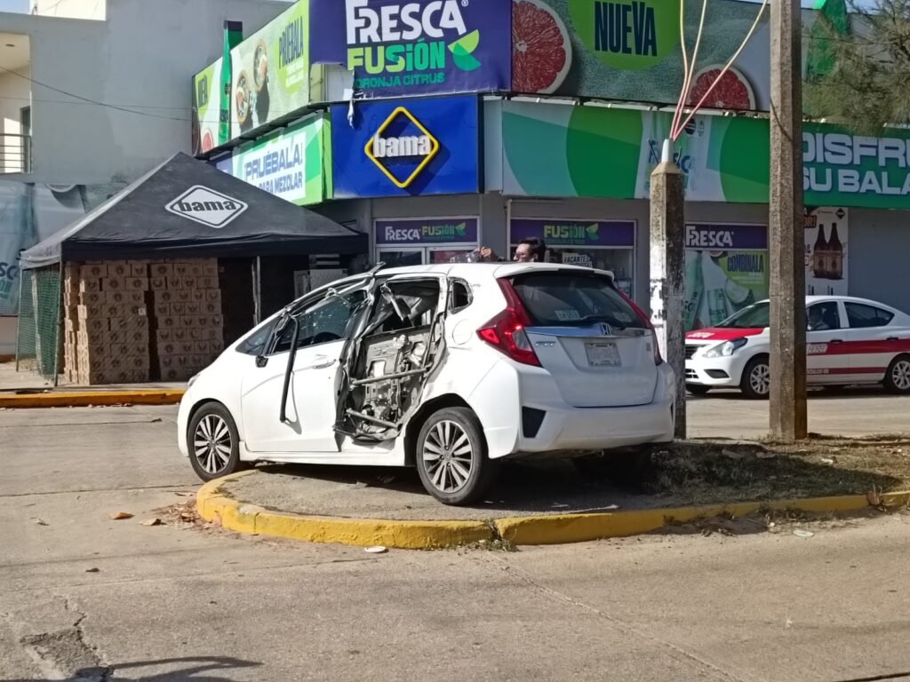 El fuerte impacto provocó que el auto acabara con daños en el parabrisas, y se le desprendiera parte de la puerta, además de acabar arriba del camellón.