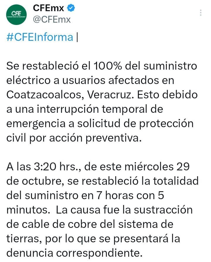 La CFE informó que el restablecimiento total del servicio se logró a las 3:20 de la madrugada de este miércoles 29 de octubre, tras siete horas y cinco minutos de labores ininterrumpidas.