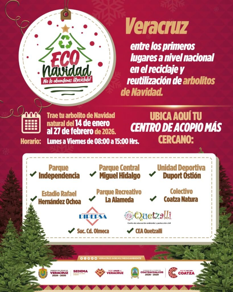 El Gobierno de Coatzacoalcos, que preside el alcalde Pedro Miguel Rosaldo García, se integró a la campaña “Eco Navidad, no lo abandones, recíclalo”, impulsada por la Secretaría de Medio Ambiente del Estado (Sedema), con el objetivo de promover la recolección y reciclaje de pinos navideños naturales.
