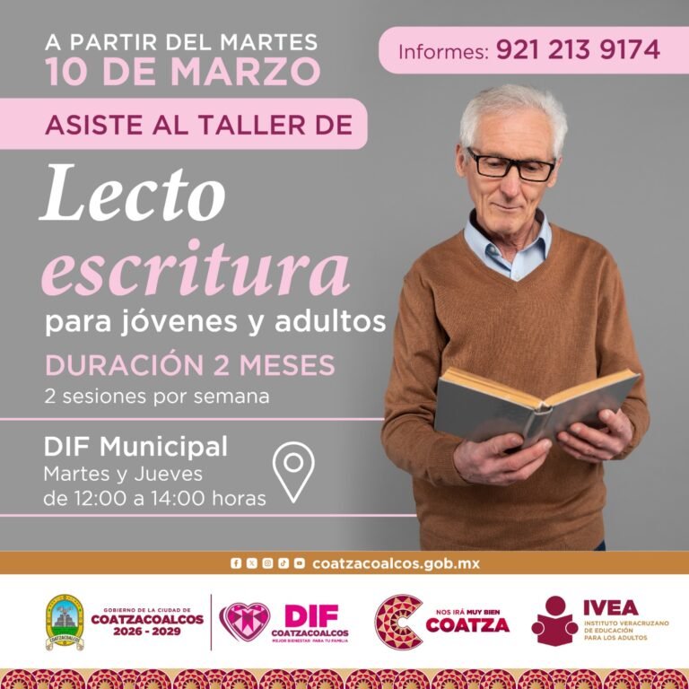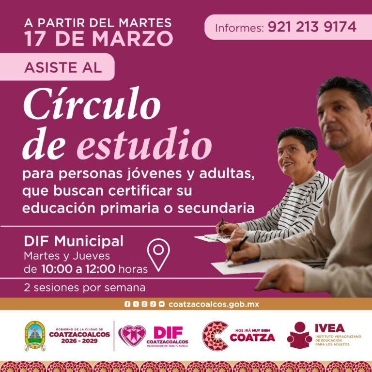Coatzacoalcos, Veracruz, 7 de marzo de 2026.– El Instituto Veracruzano para los Adultos (IVEA) y el Sistema DIF Coatzacoalcos, presidido por Sonia Marie Salvador Goraieb, anunciaron una serie de talleres y programas educativos gratuitos dirigidos a jóvenes y adultos con el objetivo de fortalecer su formación académica.