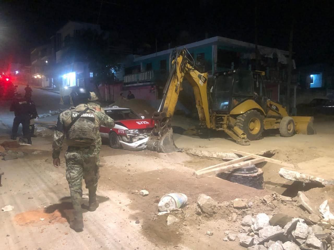 De acuerdo con versiones de vecinos, el vehículo —un Nissan Tsuru habilitado como taxi con número económico 672— cayó en una excavación abierta como parte de la obra.