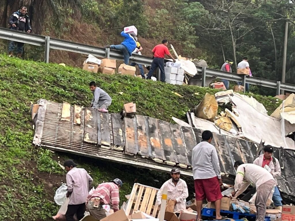 A través de redes sociales comenzaron a circular imágenes y videos donde se observa a decenas de personas cargando mercancía, mientras la unidad permanecía volcada sobre la autopista.